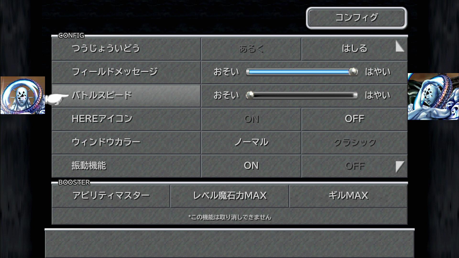 ――やれ。これまで、私はバトルスピードは最速にするものだと思ってきたし、他の方々の攻略を見てみても、ほとんど気にされていないようであった。が、このように、バトルスピードを遅くすることによって有利になれる場合も存在するのである。そういうわけで、これからFF9の縛りプレイをやろうという方が居たら、この「バトルスピード」に注目することで、まったく新しいプレイができる…かもしれない。