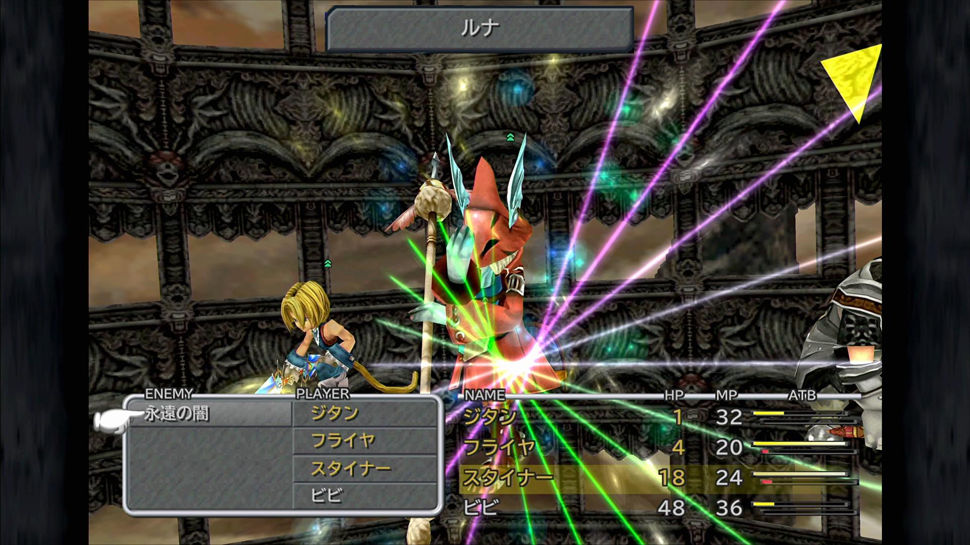 そう言えば、具体的な戦い方を全く書いていなかった。「適当に戦う」という元、ジタン・フライヤ・スタイナー・ビビの全員が、「永遠の闇」戦の装備をしてバトル開始をし、いつものように「ルナ」でバーサクとなって、あとは見ているだけである。適当と言ったが、確かにこれは適当だ。