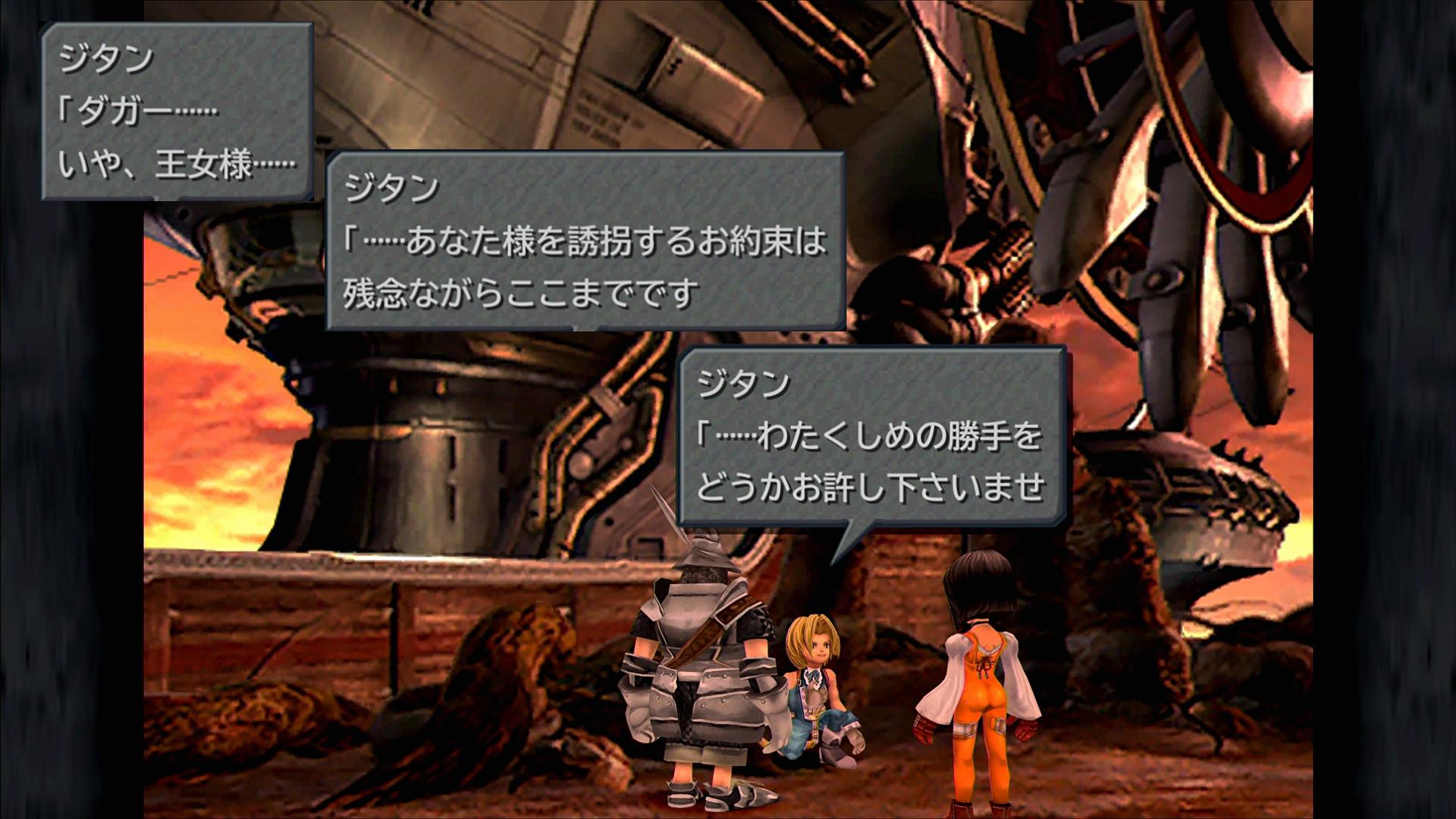 …さて、このエンディングについては、名シーンが山盛りであり、既に多くの要素が、様々な人々によって語られている。そのため、私はあえて、あまり注目されないところに触れてみたい。それは、ジタンが単独行動を始める際に、ダガーに対して、「あなた様を誘拐するお約束は、残念ながらここまでです」と、芝居じみたセリフを言うところである。