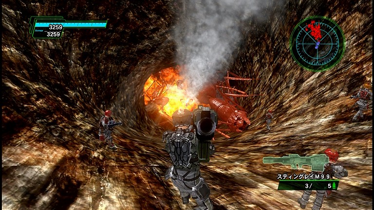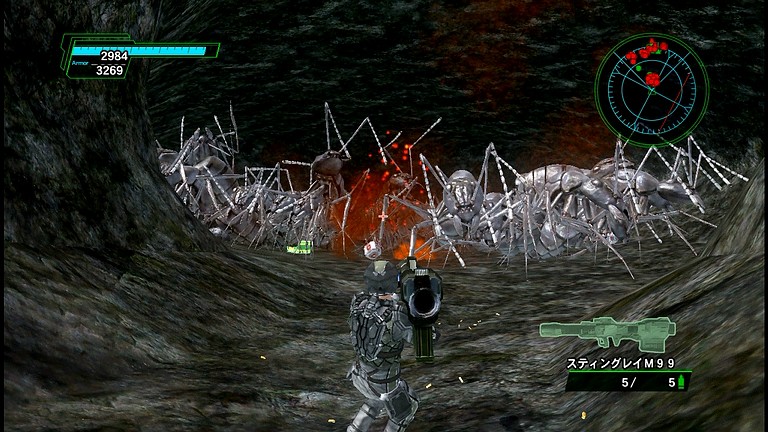 ・・・さて、ミッション攻略を進めていく。ちなみにもう片方の武器は、引退したスティングレイM99の後継ということで「グレネードランチャーUMAX」を用いていく。「放物線上の弾道を取ること」や「リロード時間」「弾数」で劣るが、威力と爆破範囲で勝り、この先も黒蟻を一撃で葬ることができる。そんな感じで、序盤は普通の地底突入ミッションなので、例によって敵を狭い通路に引き寄せ、爆発物を使って処理していく。