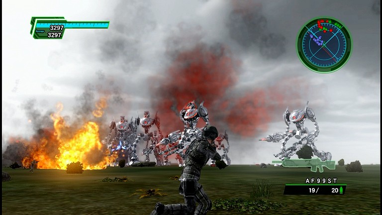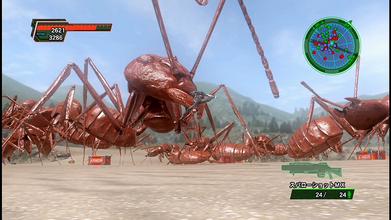 ・・・さて、EDFシリーズでは「ミッションが進むごとに少しずつ敵の体力や攻撃力が上昇する」というシステムが存在する。そしてこのミッションから、ついに黒蟻をスティングレイM99一撃では葬れなくなってしまった。これでは爆発物としての利用価値が大幅に落ちてしまうため、今回も「A3プラズマボンバー」を背負って出撃する。もう片手の武器は、M22と同様の理由でSTではなく「AF99」を装備していった。