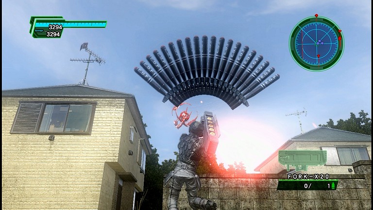 そんなこんなの「レッドカラー」であるが、動きが速く狙いづらいという特性は変わらないため、今回は誘導ミサイルの「FORK-X20」を使用することにする。こいつは、250ダメージのミサイルを20発同時発射する兵器であり、一度真上に飛んでから誘導を開始するため、遮蔽物がある環境でも問題なく使用することができる。合計ダメージが5000と高いことや、同時ロックオン可能なのが1体だけということを考えると、ほぼレッドカラー専用兵器と言って良いであろう。