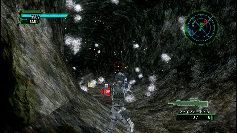 ・・・ということで、ミッションが始まったらプラズマボンバーで敵を牽制しながら急いで移動し、目的の場所に着いたら、前後に気を配りながら敵の数を減らしていく。この場所だと、敵に真後ろを取られる場合が多いのだが、それでも気を付けていれば何とかなるレベルではある。そして、ある程度敵の数を減らせば、もう回り込まれることもなくなるため、こっちから出て行って敵を殲滅すればOKである。戦略が決まった後も決して楽では無かったが、それでも何度かやればクリアできる程度の難易度までには安定させることができた。