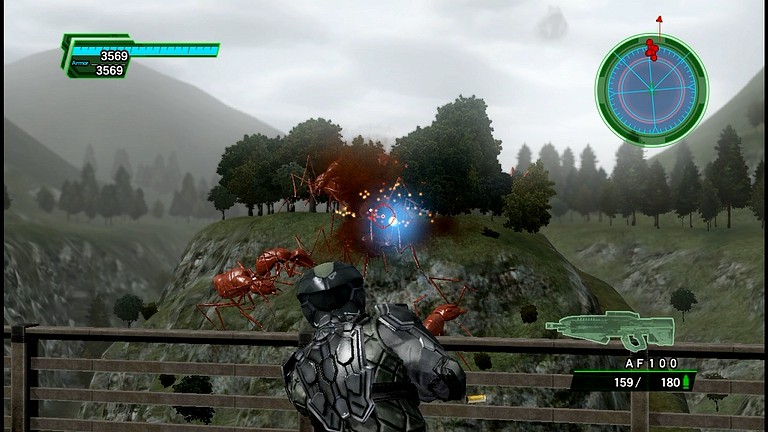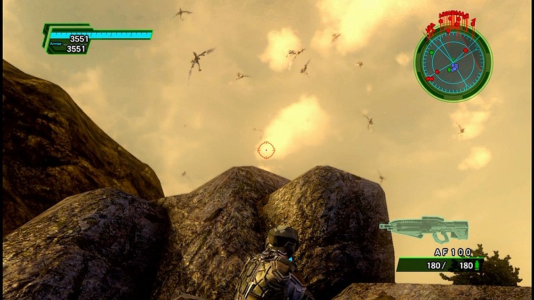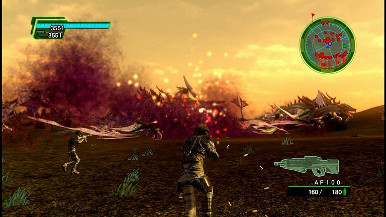 ・・・さて、開幕は目の前にいい感じの岩があるため、そこに隠れて敵の火炎をやり過ごすことにする。これをしないといきなり死ぬ。その後は、ひたすらAF100で射撃していくだけなのであるが、やはり数が最大なうえに生き残りの赤蟻まで参戦してきたため、「拘束される→倒す→また拘束される」という悪循環に陥ってしまう。味方兵士もあっという間に分断されて全滅してしまい、すぐにたった一人で孤独に戦うことになってしまった。リバースシューターの残弾も少なく、ドラゴンの火炎は数百の体力を軽く奪っていってしまう。ピンチである。