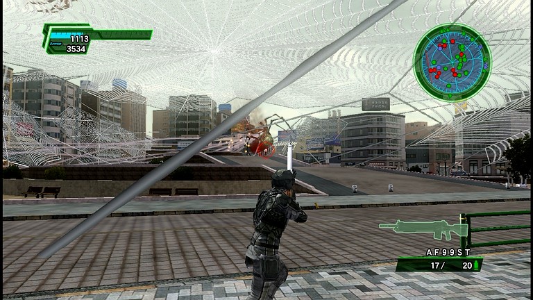 続いてのミッション「高所狙撃戦」は、ビルの屋上でスタートし、敵の航空戦力と戦うというもの。ビルの下には蜘蛛がひしめいているため、とにもかくにも輸送船を撃墜し、味方が近づけるようにしなければならない。
