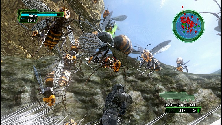 ・・・さて、敵は蜂のみということで、装備は定番となった「スパローショットMX」+「リバースシューターT2」で決まりである。そんな感じで蜂をどんどん撃墜していき、中盤以降は目を覆いたくなるような数の敵が出現するが、こちらにも少数とはいえ味方兵士が存在するため、リバースシューターで体力を適時回復していけば、かなり長く戦い続けることができるのだ。