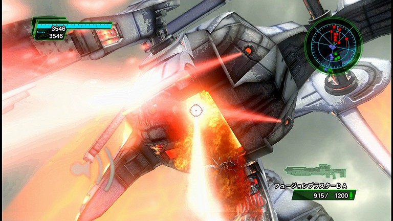 ――そうこうしていると、四つ足要塞は黒蟻を投下しながら何故か遠くで停止するため、回復アイテムを回収しながら要塞の真下にまで接近していく。ここで、前述の通り「フュージョンブラスターDA」では1回のハッチ開閉で敵をギリギリ倒しきれないため、まずは1回ぶんAF100でダメージを蓄積させておく。その後、再び攻撃可能になったら、フュージョンブラスターを撃ち込んで終了である。途中、粒子ストリーム砲装備の青ヘクトルが登場するが、まとめて焼き切ってしまえば良いだろう。