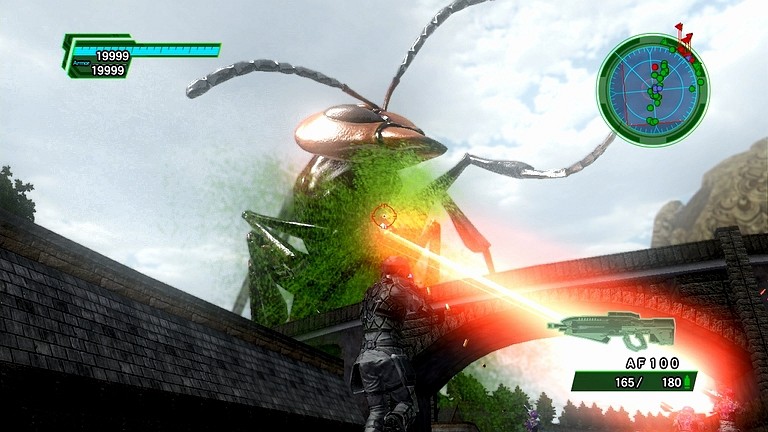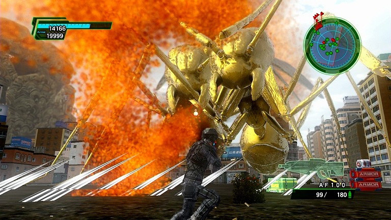 …基本的な戦い方は、1体を相手にした時と同じで、左右移動を中心にして敵の酸を回避しながら、地道にダメージを蓄積させていくことである。ただしもちろん、今回は敵が2体であるため、どうしても酸を喰らってしまうような配置になることも多い。その際にも、敵の尻に密着して全弾が直撃するような状況だけは絶対に避けるようにしたい。つーか、全弾直撃したら即死します。マジです。その他の要素としては、広場の端のほうに行ってしまうと、避けたはずの酸が背後のビルに反射して意味も分からず死ぬため、これまたできる限り中央で戦うようにしたい。あれだな、東方神霊廟の2ボスラスペみたいな感じだな。俺はあそこで無慈悲にボムる。地球防衛軍が弾幕シューティングだったらこのパートとかボム乱射だな。