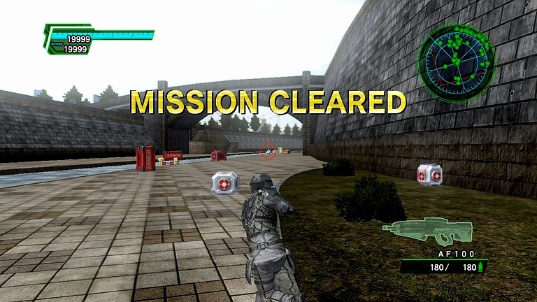 ――やり方は簡単で、現在地からそのまま河の中をオメガ部隊と共に前進し、ヒルが射程内に入ったら射撃を開始する。その後は、鎧蜘蛛が目の前に現れた時のみ雑魚を攻撃し、それ以外はずっとヒルを撃ち続ける。そのうちに、ヒルの体力が25%に達し、3回目の崩壊が発生するが、構わず思い切り撃ち続けよう。今回のみ、ボスが現れるためのダメージがプラス10%の体力15%であることは覚えておきたい。そんなこんなで、たった2分ほどでヒルの体力を45%→15%と減らすことに成功し、レーダーの右端にぽつんと鎧大蜘蛛が現れたことを確認した。いよいよ、最後の戦いだ。