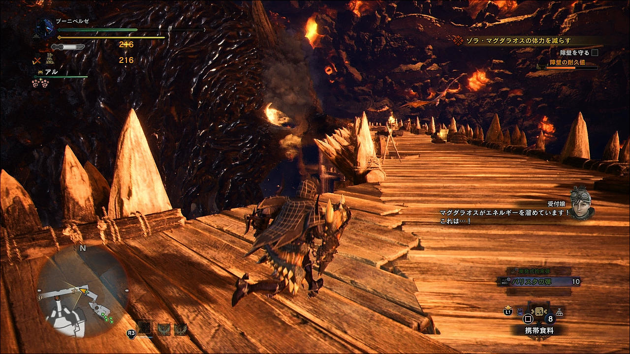 …まず、@に関してであるが、敵は砦を頻繁に攻撃する。まあそれだけなら当たり前なのだが、敵の溜め攻撃は3発当たれば砦が破壊されてクエスト失敗であり、無対策だと10分も耐えられない。そのため、「単発式拘束弾」というものをバリスタで発射し、相手の攻撃動作をキャンセルさせなければならない。幸い、拘束弾は砦のマグダラオスに向かって右側と、船に降りてすぐの場所の計2ヶ所で拾えるため、それを使って、受付嬢が「エネルギーを溜めています」と予告したら、近くのバリスタに走り込んで拘束弾を撃っていけば良い。受付嬢の貴重な活躍シーンである。