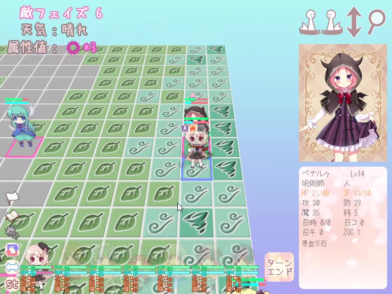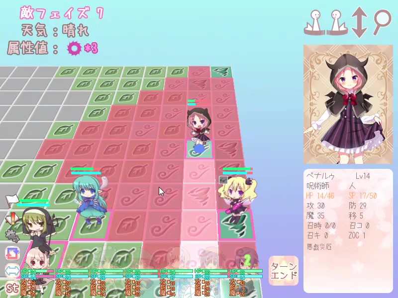 ・ペナルゥ:極力近寄らず、「悪戯災厄」を回避する。最初はマジックノヴァ(射程4+範囲3)で攻撃し、極力ポイズンの射程を避ける。