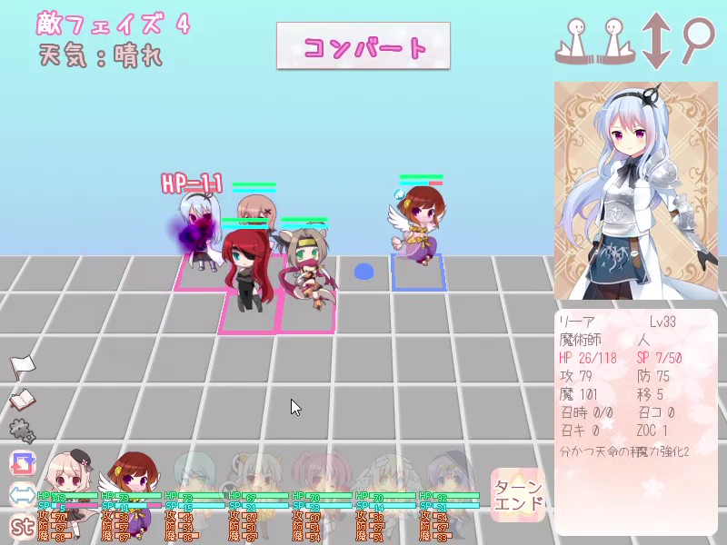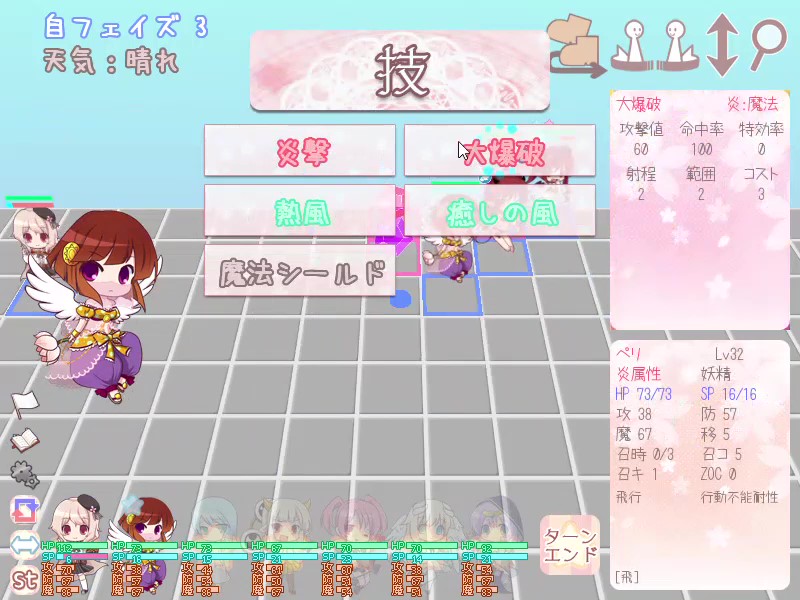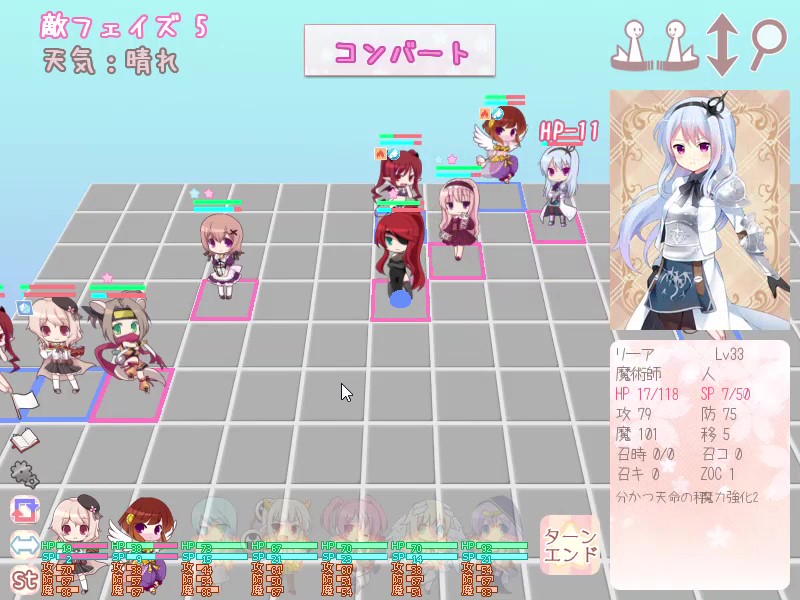 フェイズ3(〜1分16秒):イルセ、インプ2体、ペリで一斉攻撃。敵(リーア)はジャンプゲートを使用してエンド。