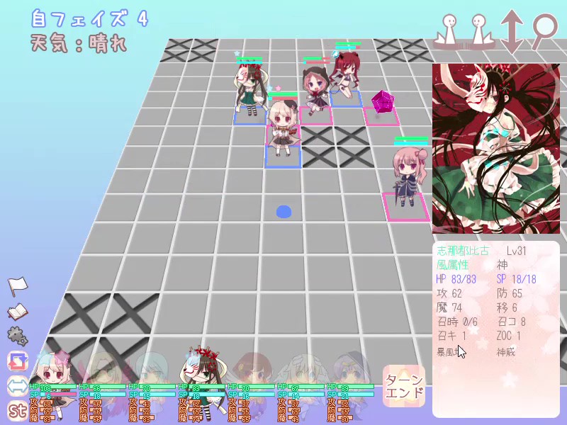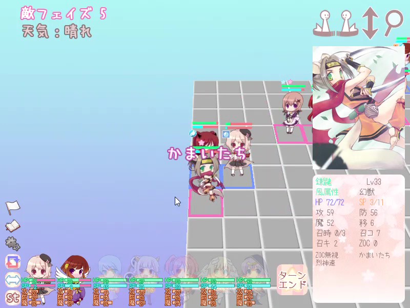 キャラ特性「神威」は、技を使う度に使った技が使用不可になる代わりに、使った技に応じて技回数or移動回数が1回増えるというもの。