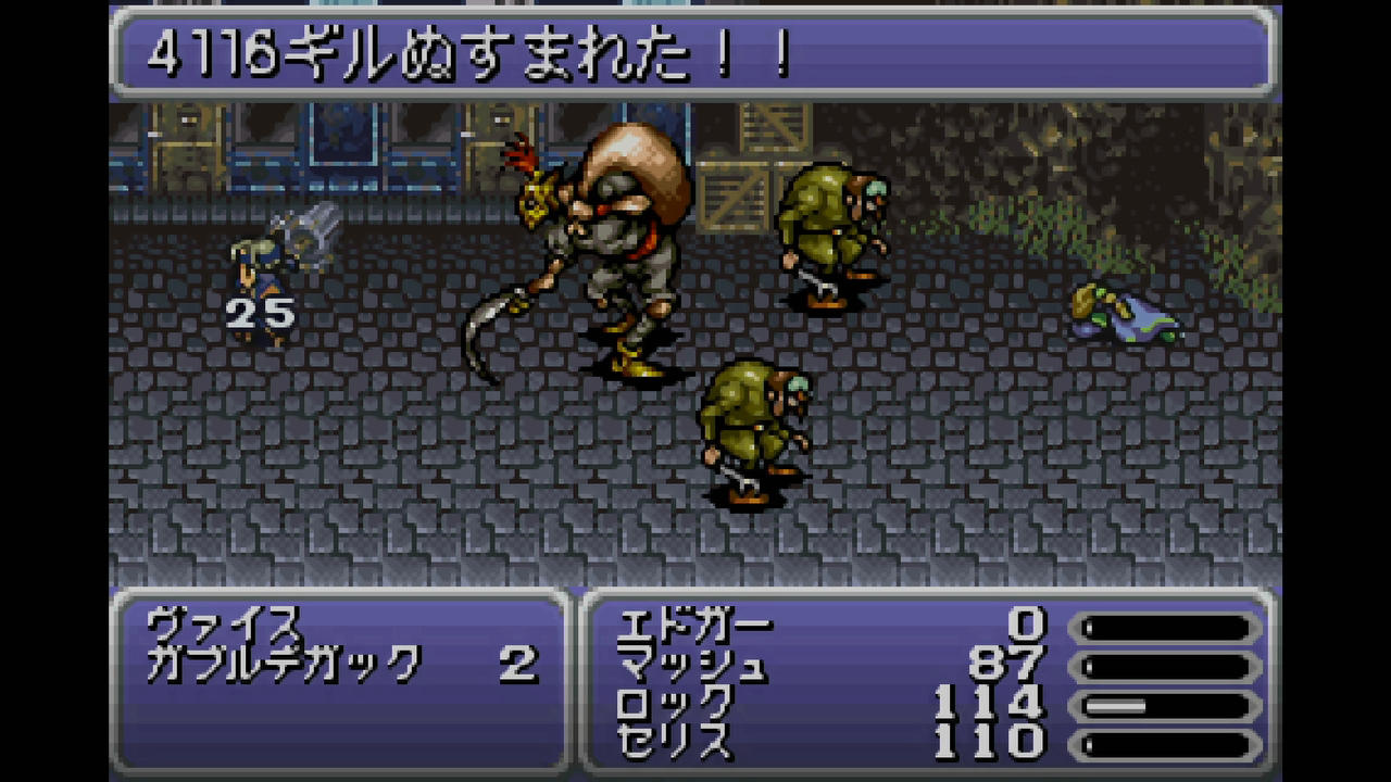 ――その後のケフカ戦については、パーティはセリス・ガウ・ロック・マッシュで挑む。ケフカの攻撃で主力となるのは魔法であり、セリスの魔封剣を使っていれば、たまに打撃が飛んでくるだけの敵となる。というわけで、ガウが「ストレイキャット:ネコキック」を繰り出し、約600ダメージを連発する。そんな感じで、途中に敵の打撃によってロックが殴り殺されたものの、割と楽に勝つことができた。