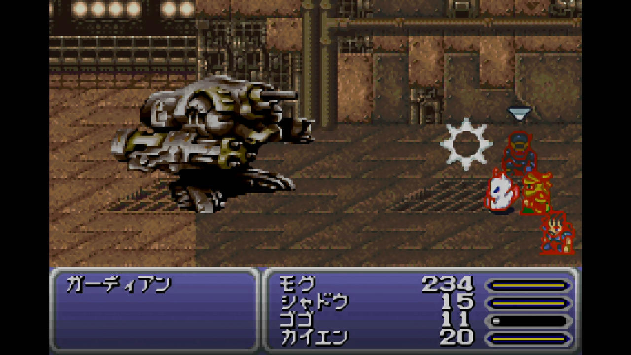 …その後は、特に意味もなく、第3パーティのモグを使って第1パーティのルートを逆行してみたりもしながら、先に進んでボスの「ガーディアン」戦である。こいつは、崩壊前の帝国城やサマサ襲撃の際に通せんぼをしている敵であり、「ここは、とおさん!!」というビラン大兄のようなセリフは印象的である。その際は、無敵という特殊なステータス効果を得ており、絶対に倒すことはできない。一応、混乱けむりだまなどで勝利扱いにはできるようだが、その後の展開が変わることは無い。そんな因縁の「ガーディアン」と、この崩壊後の最後の最後で決着を付けられるというのは、物語的にも良い演出であると言えよう。最近では、FF14におけるFF6企画の1体にも選ばれたそうだ。