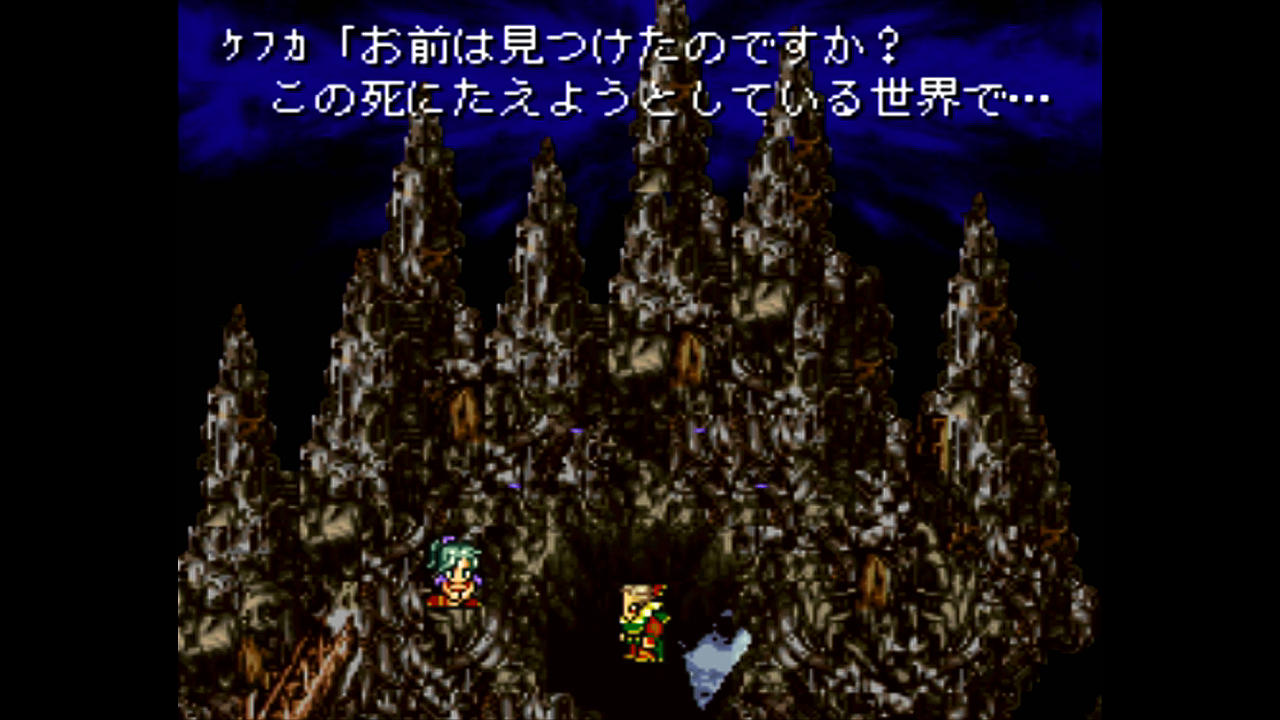…瓦礫の塔を登りきった一行は、待ち受けていたケフカと相対する。ケフカは、超常の力を手にしており、全てを破壊することも可能となった。そして一行に、この滅びゆく世界で生きる価値など何が存在するのかと問う。それに対し、パーティメンバーたちは、“生きることの意味”を次々と語り続ける。だが、ケフカは