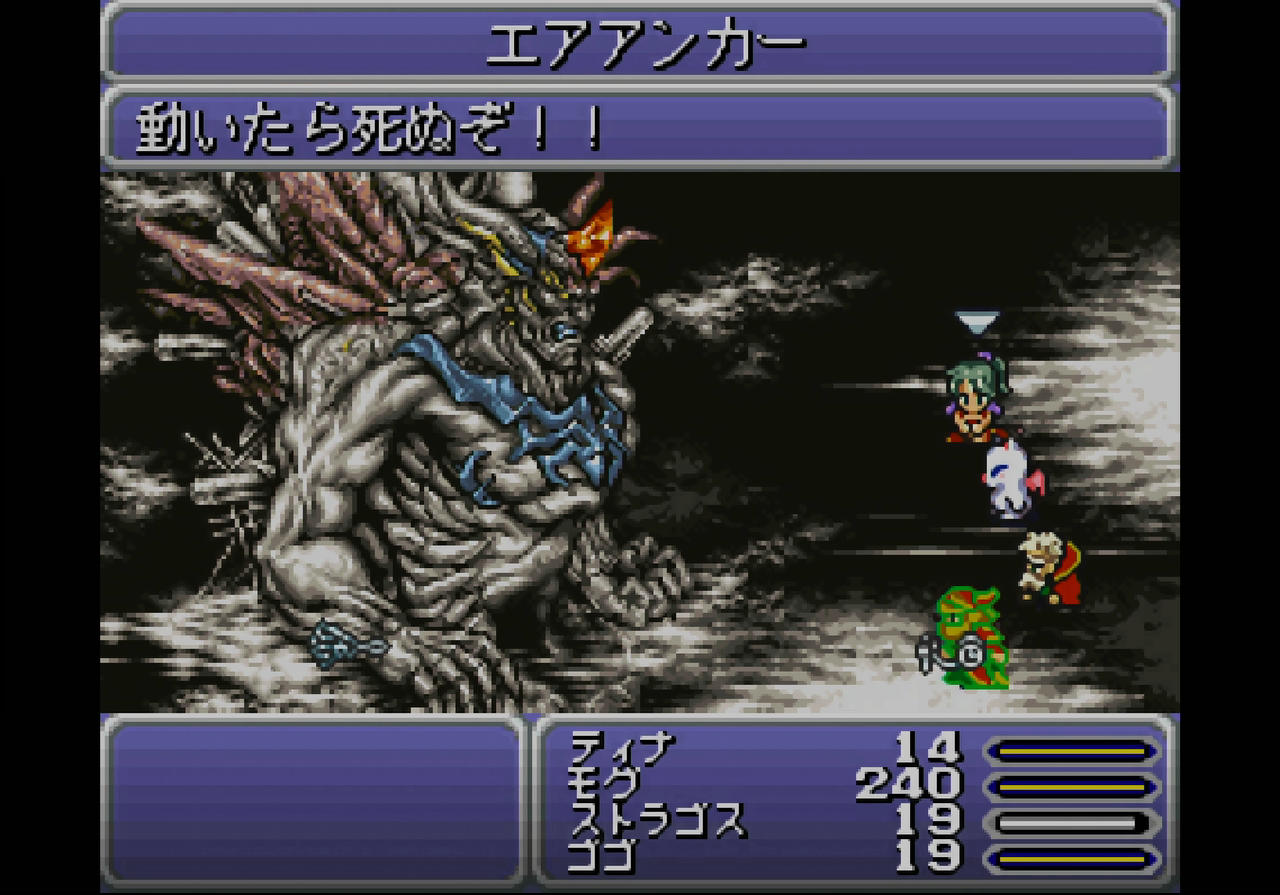 エアアンカーによる一撃必殺である。敵の、中央少し右上にある、盾というか板のような部分は「きかい」という名前であり、こちらには即死が有効である。この敵は、雷・炎・氷の全体攻撃に石化などと非常に攻撃が多彩であるため、さっさと倒さなければ非常に危険である。具体的には、1ターン目の攻撃として「拡散レーザー(雷全体攻撃)「魔導レーザー(雷単体攻撃)「グラビティーボム(単体に現在HPの1/2のダメージ)のどれかを、2ターン目は「拡散レーザー」「ミサイル(単体に現在HPの1/4のダメージ+スリップ)「アトミックレイ(炎属性全体攻撃)を使ってくる。敵は、かなりの確率で先手を取ってくる(100%?)ため、エアアンカーで死亡するまでの時間も含め、この2ターンは何とか乗り切らなければならない。モグこそ、「英雄の盾」で全属性を無効・吸収できるものの、他のキャラクターは完全耐性を持っていないため、出鼻をくじかれるとかなり苦しい戦いになるだろう。