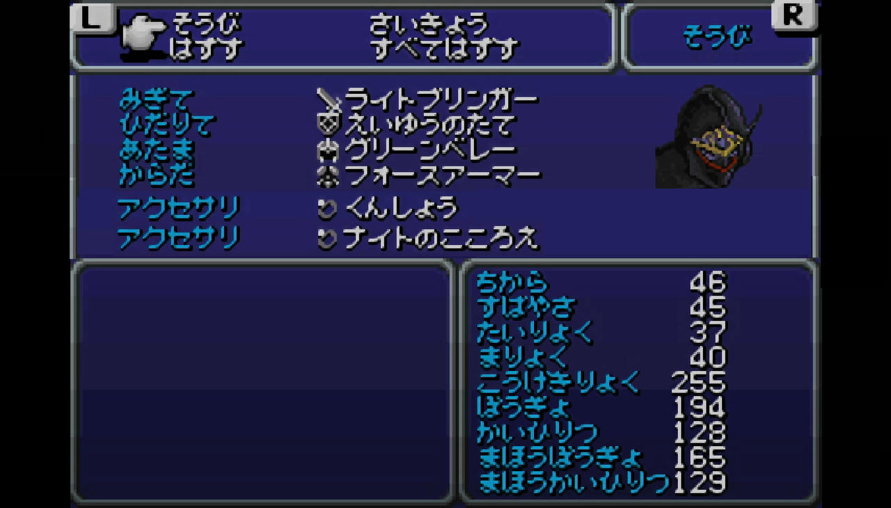 続いてのキャラはストラゴスである。「勲章」でライトブリンガーを装備することにより、魔法回避率128以上を達成できる。
