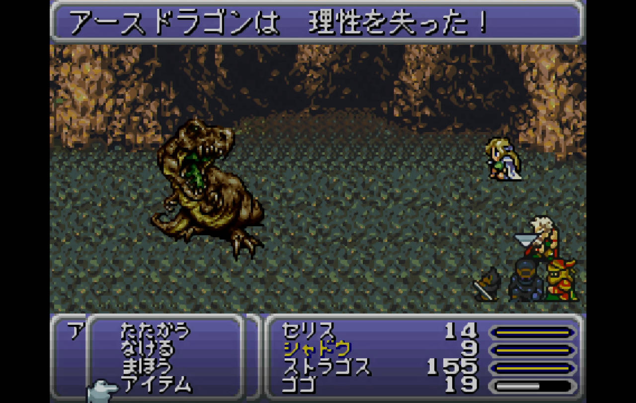 …そして、この先の脇道にて、ボスの「強化アースドラゴン」戦を行う。こいつに関しては、「クエイク」を開幕で使ってくる確率が高く、「フォースフィルド」が間に合わない。そのため、「大地の衣」で地属性から身を守るのであるが、無効化ではなく吸収であるため、ナイトの心得によるかばう作戦が乱れてしまう。一方、レビテト状態で回避をしようにも、魔法レビテトには対策を持っており、「天使の羽」も装備する枠が無いキャラが居るほか、そもそもシャドウが居る時に天使の羽という時点でバグが起こりそうで怖い…と、細かいところで完全な対策は不可能となっている。しかしながら、結局のところ、敵は物理回避率128&全属性耐性のシャドウを倒せないため、自分から負けにいかない限り、本バトルで敗北することは無い。