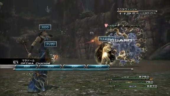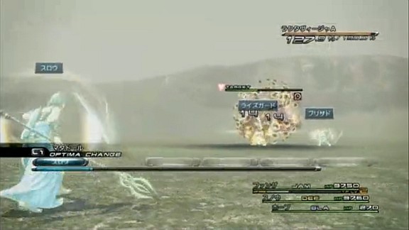 ・・・まず開幕は「ラクタヴィージャB」のほうにターゲットが合っているため、A「JAM+DEF+HLR」でスタートして「スロウ*2」を入力し、同じオプティマのBに切り替える。これを繰り返してラクタヴィージャBをスロウ状態にできたら、次はAを狙っていく。このAが最初に倒す1体となるため、今度はAと@「JAM+DEF+BLA」を使い、チェーンボーナスを増やしながら後ろに下がっていく。特に、最初はホープにスモーク効果の補助魔法が掛かっていてチェーン蓄積効率が極めて良いため、この時に攻撃できれば後の展開が激しく有利になる。そしてファングがDEFからしっかりと距離を取れたら「スロウ*5」を入力し、前述の@→A→Bと回すルーチンに入るのだ。