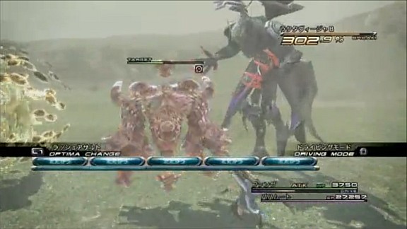 ――ところで。FF13ではオプティマチェンジを行うと、キャラクターが専用の動作を取る。例えばファングならば、槍をクルリと回して順手と逆手を入れ替えるようなアレである。そのモーションが発生するのは、基本的には「オプティマチェンジを行った瞬間」であるが、打ち上げられていたり他の行動動作でモーションが取れないような最中だと、その行動が終わったあとに、オプティマチェンジの動作を行うことになるのだ。
