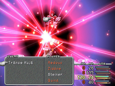 FF史上最弱のライバルキャラ、クジャ。トランスしてもその弱さは変わらず。HP 55536。「フレア」「ホーリー」「フレアスター」「リフレク」を使って攻撃してくる。フレアは回避不能耐久不可無属性魔法。ホーリーは聖属性で吸収可能…と思いきや、無効・吸収する相手には使用してこない。こちらがリフレク状態の時はフレア・ホーリー二つとも使ってこない。代わりにリフレク貫通のフレアスターを使うようになる。が、これはLevel*35=35ダメージ魔法であり、しかも回避可能なので、何ら問題ない。リフレクはこちら全員がリフレク状態で自身がそうではない時、必ず使用してくる。反撃パターンとして、(I)敵・味方全員がリフレク状態の時、反撃で「フレア」「ホーリー」を自身に反射させて攻撃してくる。(II)累計ダメージが27764以上になると、リフレク状態の有無に関わらず、「フレアスター」「ケアルガ」で反撃してくるようになる。もちろん、クジャ自身がリフレク状態の時にケアルガを使うことはないが。反撃確率は(I)と(II)いずれも50%ほど。バードキラー・マンイーター有効。暗闇が効く(←意味ネw)。
